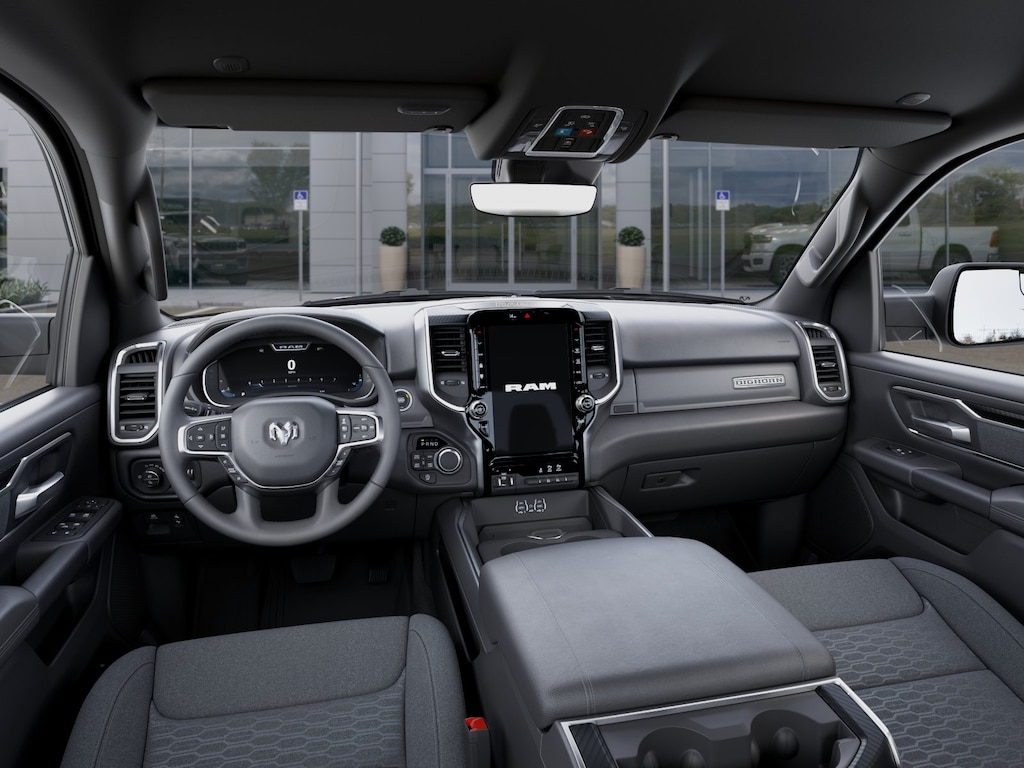Fall in love with our Big Horn cabin, tailored to fit your needs, with the Level 2 Equipment Package's heated deluxe cloth seats, a heated leather-wrapped steering wheel, universal home remote, power adjustable pedals, power sliding rear window, dual climate control, a RAM Clean-Air System, keyless access, push-button ignition, cruise control, door-sill scuff plates, and clever cargo space, and a Uconnect 5 with 12.0-inch touchscreen features GPS Navigation, voice control, Bluetooth, and a nine-speaker sound system for intelligent infotainment.