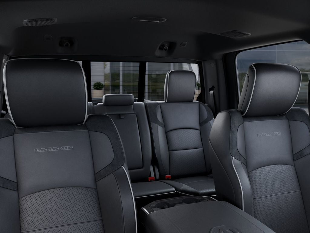 Our Laramie cabin offers a commanding experience in comfort, thanks to the Level 1 Plus Equipment Pack's dual wireless charging, heated and ventilated leather-trimmed power front seats, a leather-wrapped steering wheel, dual-zone automatic climate control, an interior 115V/400W outlet, keyless access and ignition, power-adjustable pedals with memory, a power sliding rear window, and remote start. Full-color navigation helps you find your way while staying connected with a 12.0-inch touchscreen, WiFi compatibility, Amazon Alexa compatibility, Android Auto, Apple CarPlay, Bluetooth, voice control, and Alpine audio.