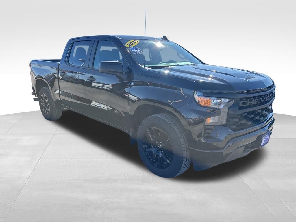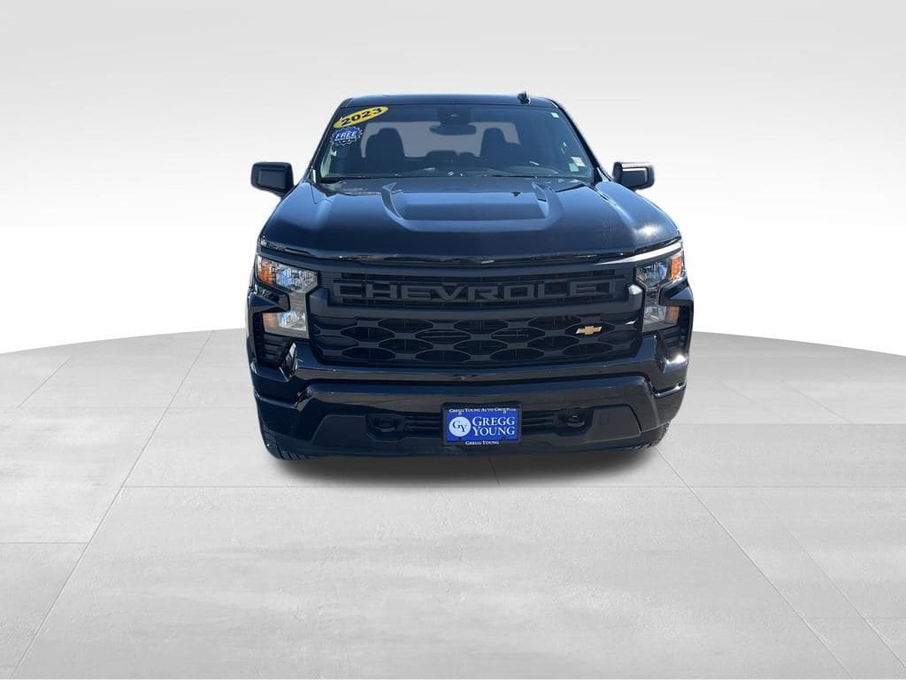 Comfortably in command, our Accident Free 2023 Chevrolet Silverado 1500 Custom Crew Cab 4X4 with the Dark Essentials Pack captures your attention in Black! Motivated by a 2.7L Turbo supplying 310hp connected to an 8 Speed Automatic transmission with tow/haul mode. A high-capacity suspension enhances capability further, and this Four Wheel Drive truck returns nearly 21mpg on the highway. Our Silverado has aggressive appeal with a powerful grille, LED lighting, bed lighting, 20-inch alloy wheels, black recovery hooks, a CornerStep rear bumper, an EZ Lift power lock/release tailgate, a trailer hitch, and our Dark Essentials Pack for a black Bowtie in front with matching tailgate lettering and nameplates.