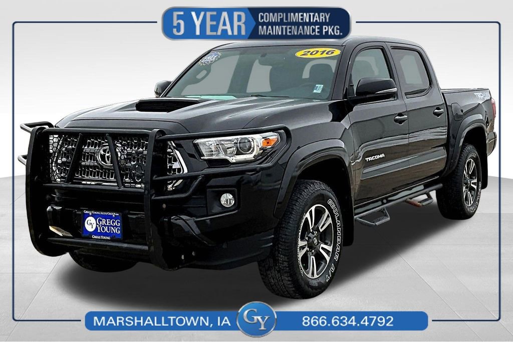 Our adventurous 2016 Toyota Tacoma TRD Sport Double Cab 4X4 is built with a bold design in Black. Powered by a 3.5 Liter V6 that offers 278hp matched to a 6 Speed Automatic transmission for an enjoyable ride. With this Four Wheel Drive, TRD Sport enjoys impressive acceleration, the power to tow/haul, and nearly 24mpg on the road. Not too big and not too small, our Tacoma TRD Sport looks tough-as-nails with its muscular fenders, LED daytime running lights, grille guard, assist steps, TRD Sport bed decals, tonneau cover, and tough-looking wheels.