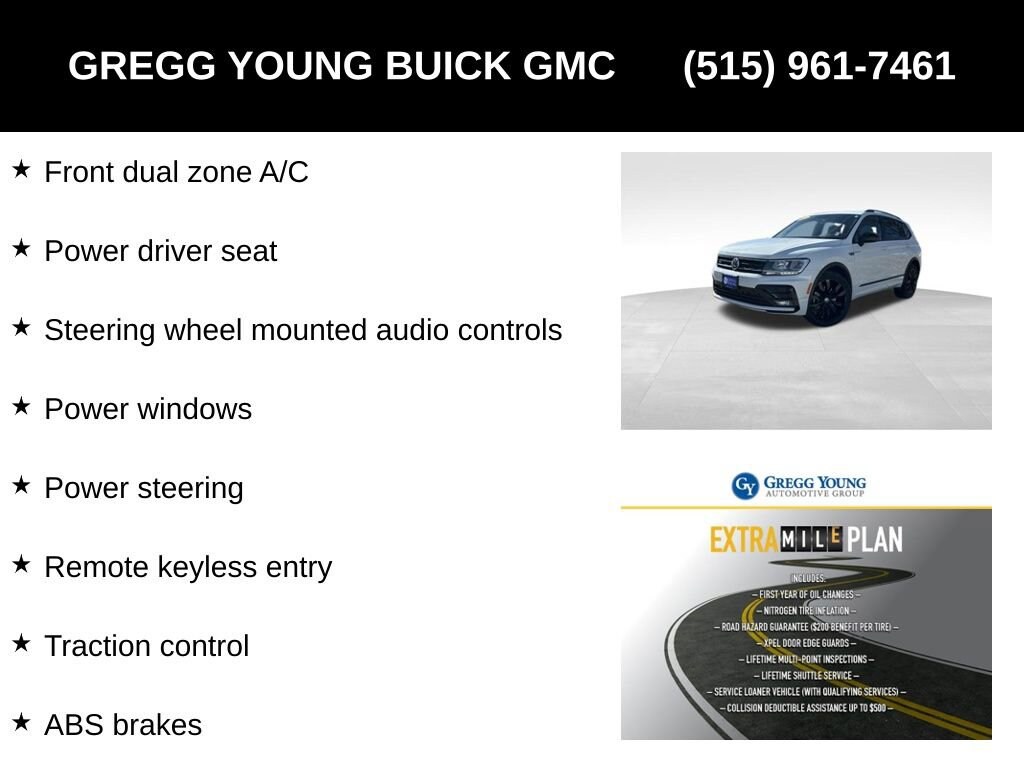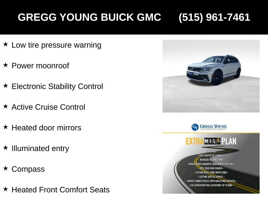 Take on life with high-tech confidence thanks to Volkswagen features such as a backup camera, parking sensors, automatic emergency braking, forward-collision warning, pedestrian detection, and a blind-spot monitor. Our Tiguan SE R-Line Black inspires you to do more daily! Save this Page and Call for Availability. We Know You Will Enjoy Your Test Drive Towards Ownership!